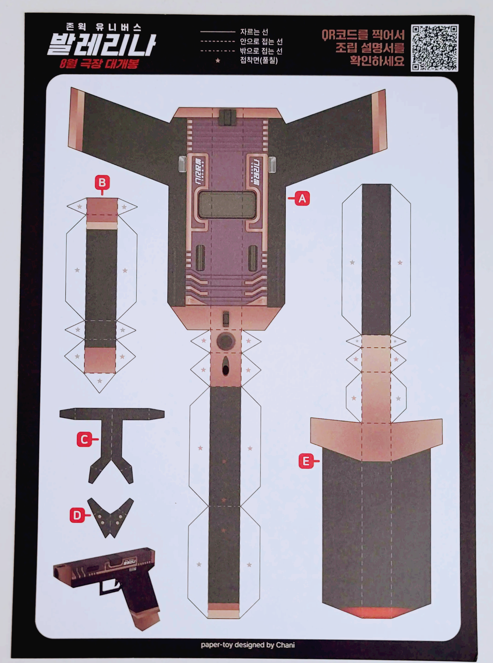 그리고 영화 홍보물도 챙겼는데요, 뒷면엔 이브 마카로의 권총 만들기 입니다. 집에 와서 혼자 조용히 딱풀칠을 했습니다. 탄창까지 별도로 있는 디테일한 종이 권총입니다.