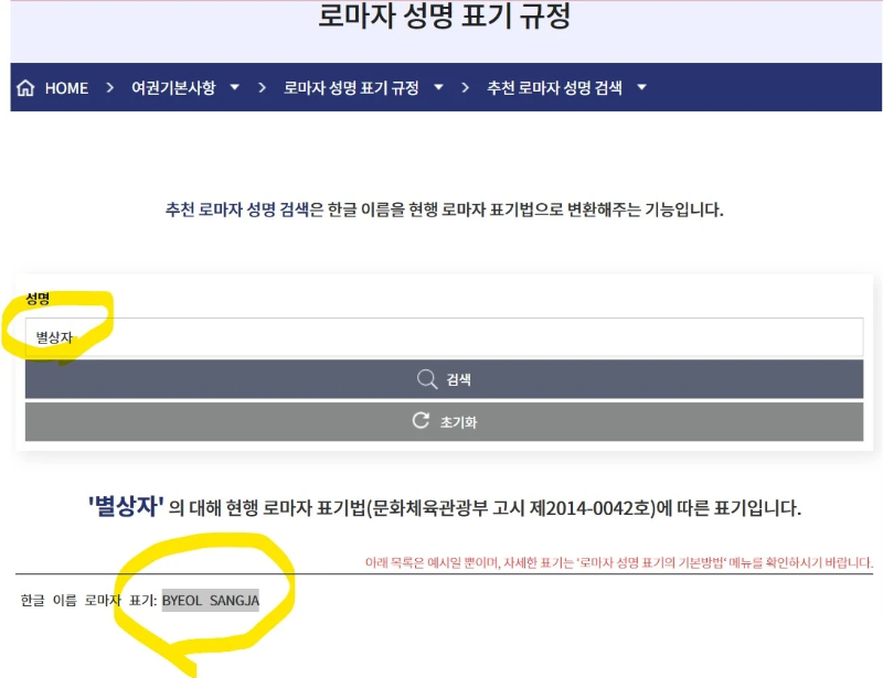 성명 아래의 빈칸에 한글을 넣고 검색을 누르면 하단에 영문으로 변환됩니다.