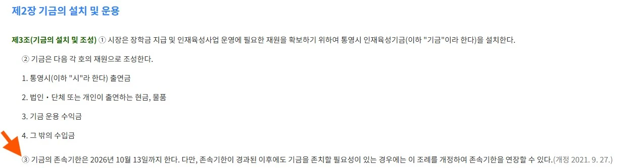 기금은 통영시의 출연금, 관련 수익금 및 기부금으로 운용하며 존속기한은 26년 10월 13일까지 입니다. 기금이 남아 있다면 계속 연장할 수 있도록 제정되어 있습니다. 또한 2023년에 제17조 장학사업의 종류에 대하여 대학생 등록금 지원으로 조례가 신설되어 있습니다.