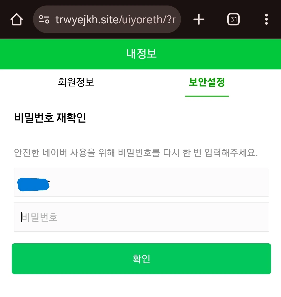 메일을 열어보니 네이버 로그인 화면과 똑같이 초록색 컬러가 들어간 화면이 나타났고, 제 네이버 아이디까지 정확하게 입력되어 있는 것이 아니겠어요?