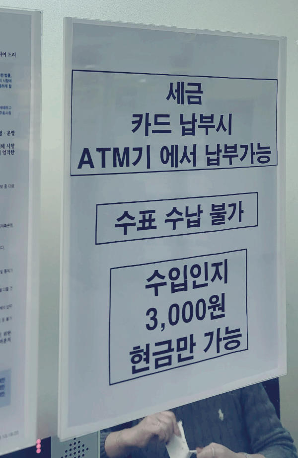입구에 은행창구에서 세금납부서를 참고하여 현금, ATM 등으로 납부합니다. '인터넷지로' 핸드폰 앱으로도 카드 납부가능합니다.