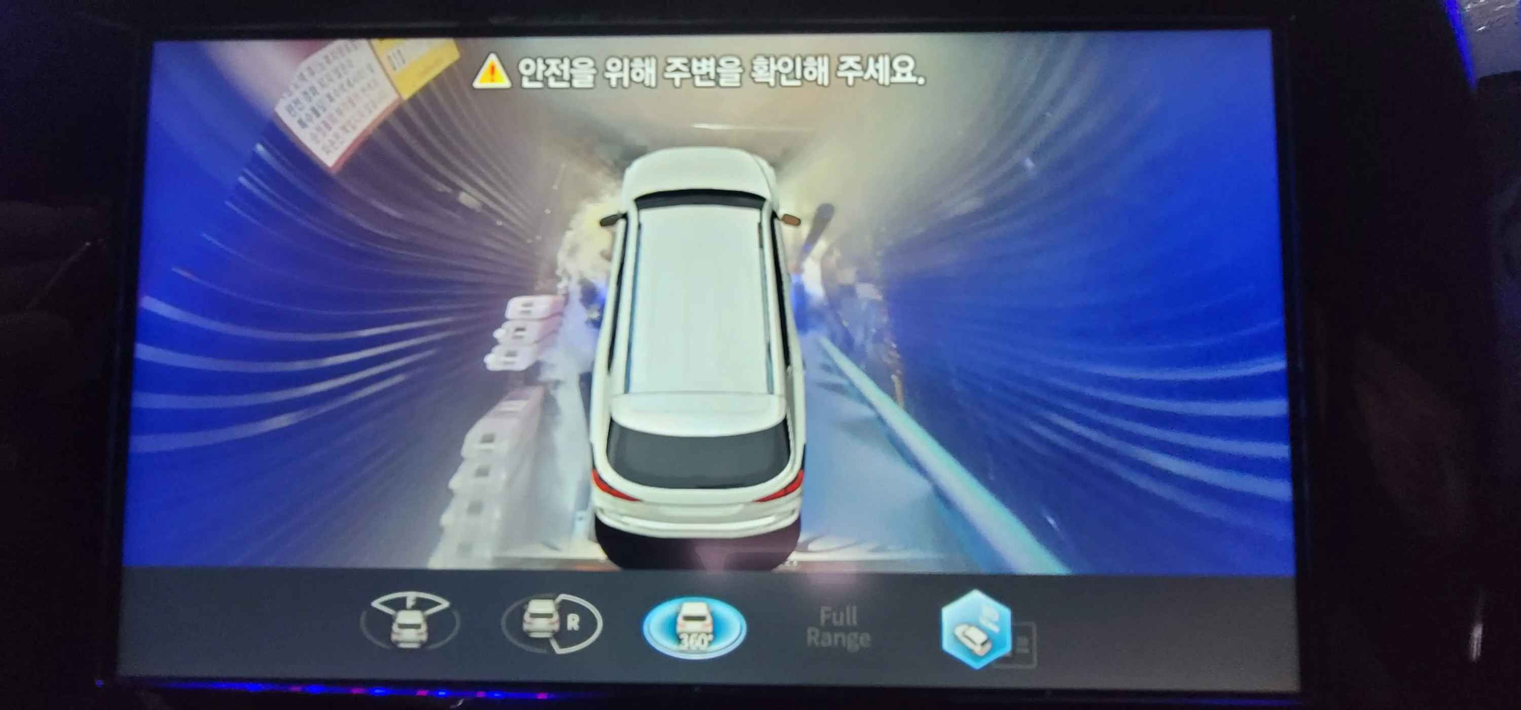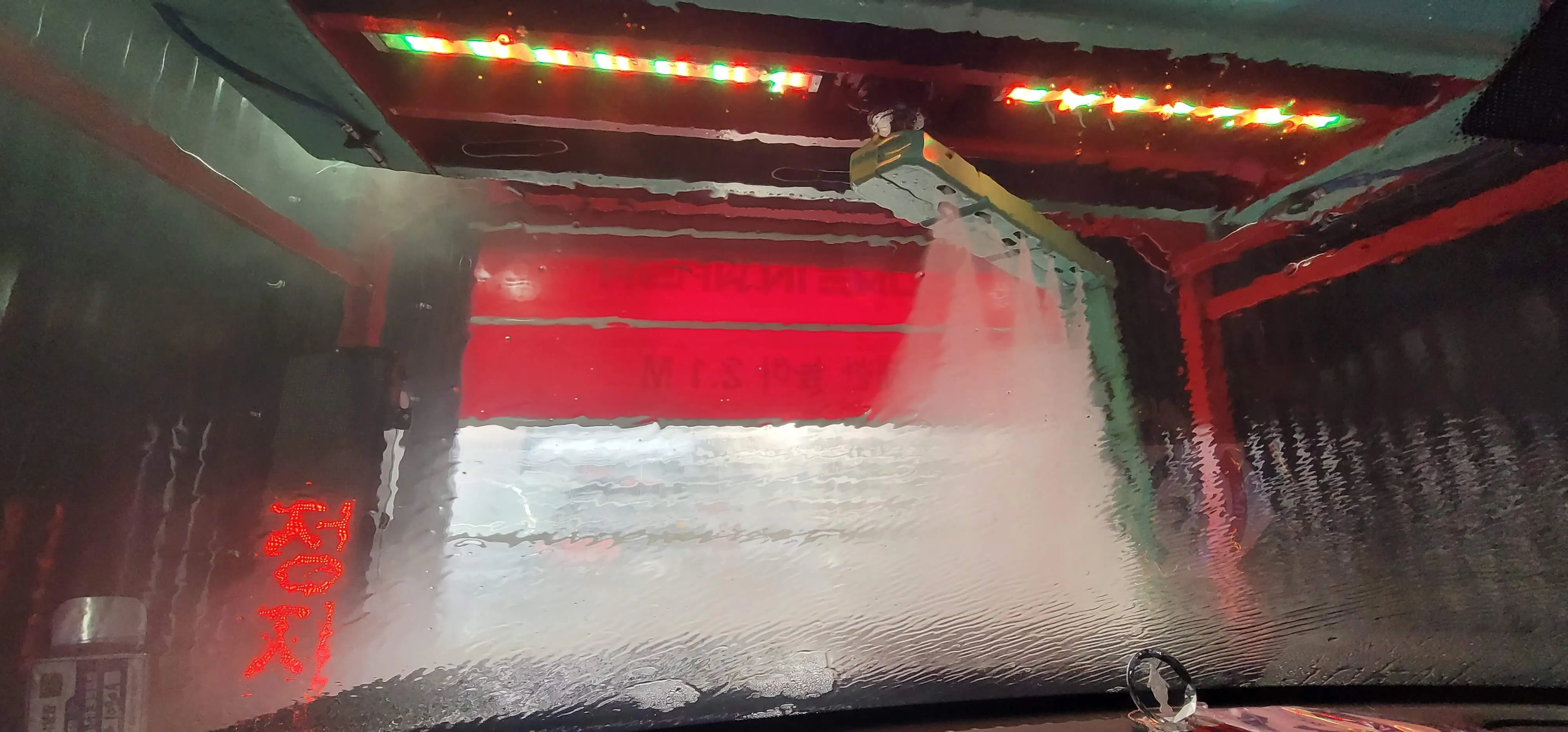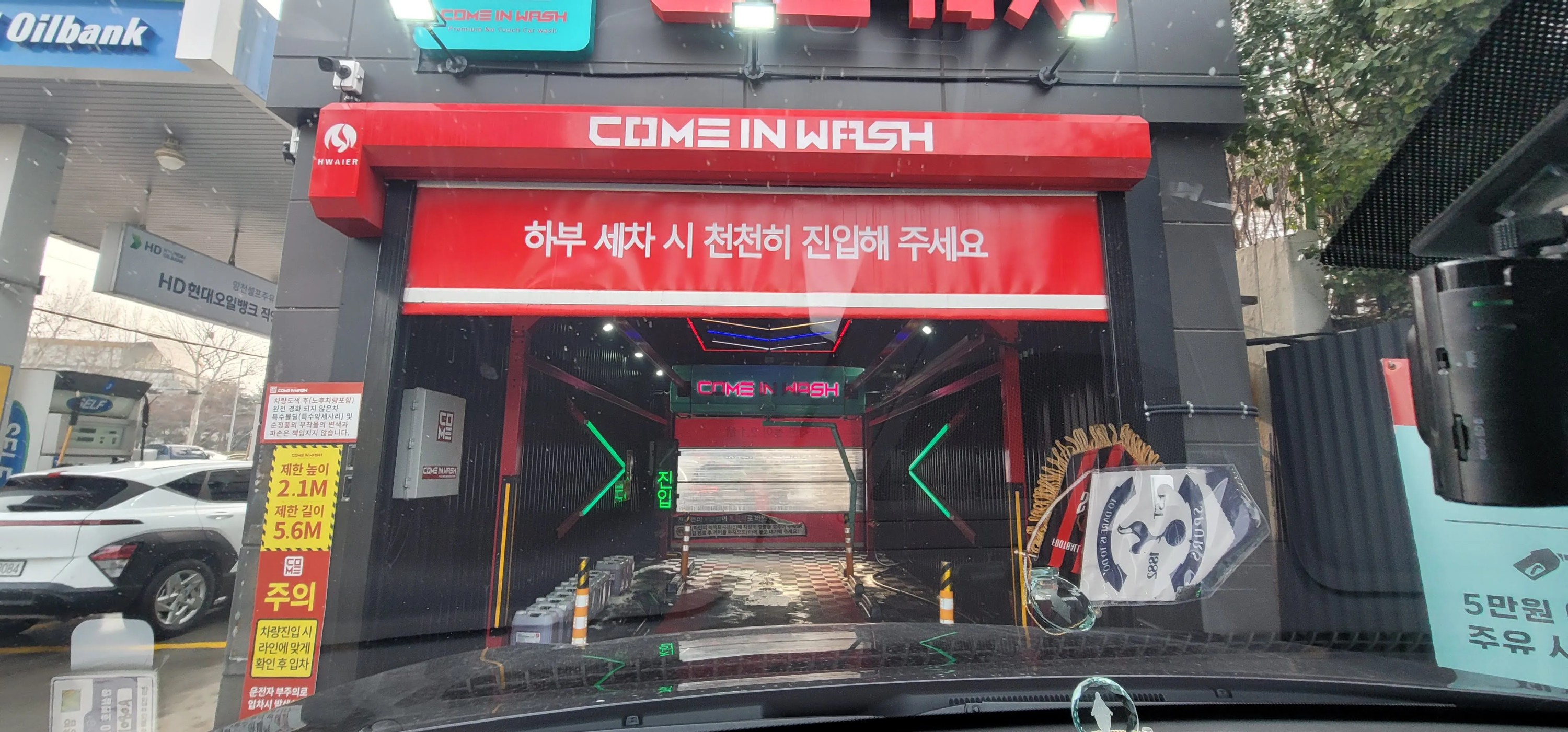 왼쪽 초록색 진입 글자가 정지로 바뀔 때까지 천천히 들어가면 로봇 팔같이 생긴 녀석이 움직이기 시작합니다. 이 녀석이 초고압 물 분사, 스노우폼, 코팅제, 건조까지 모두 담당합니다.
