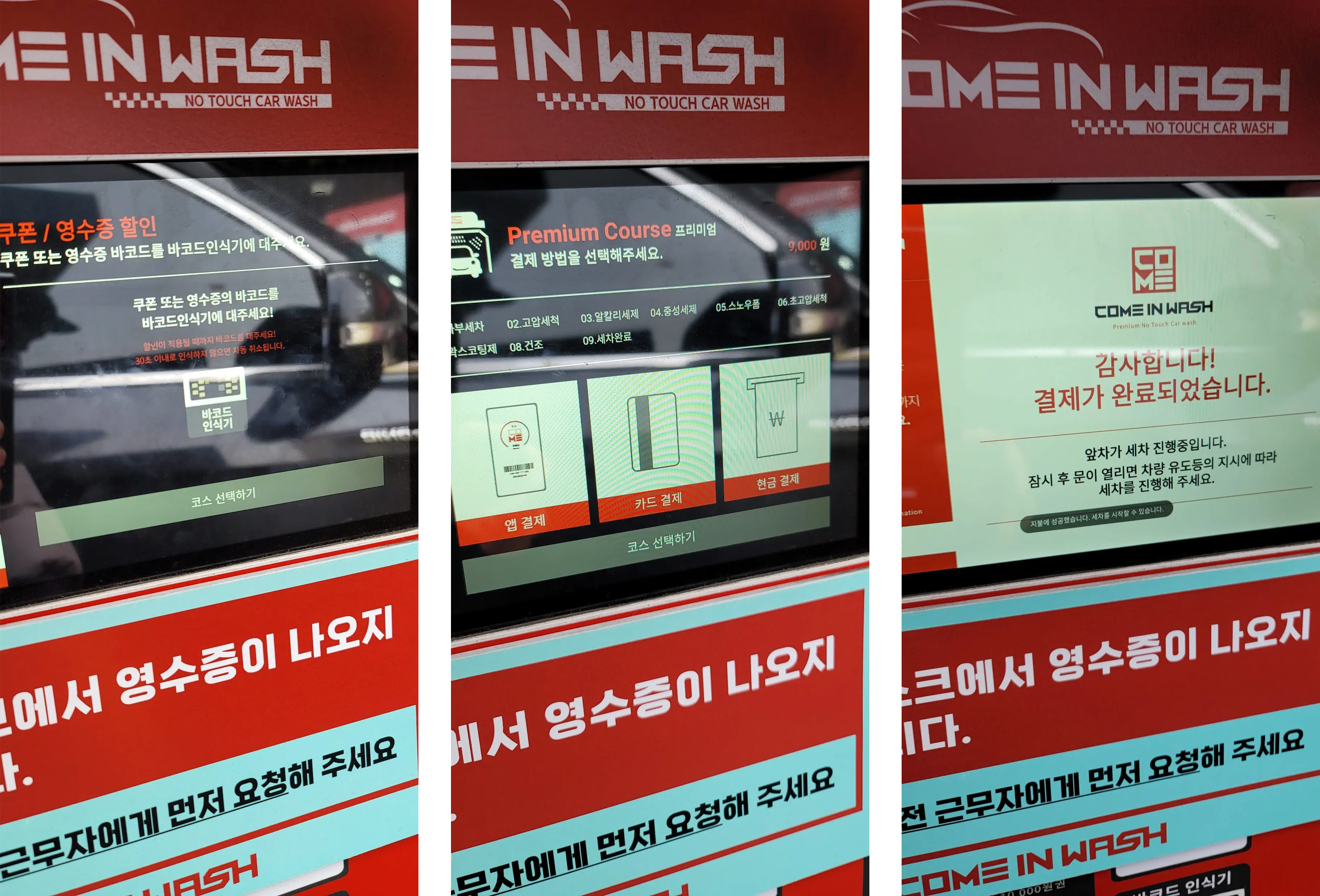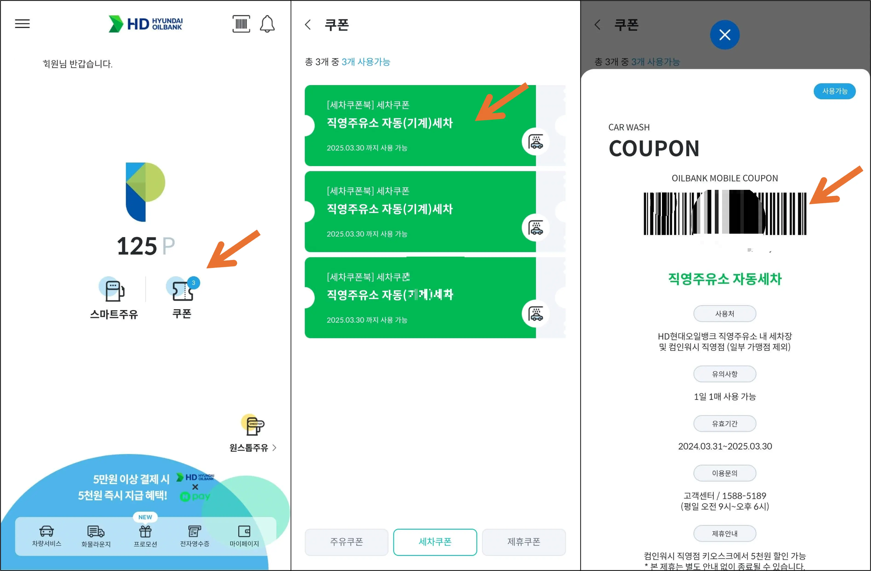 저는 오일뱅크 앱에서 구매했던 세차쿠폰을 컴인워시 키오스크 바코드 리더기에 읽혔습니다.