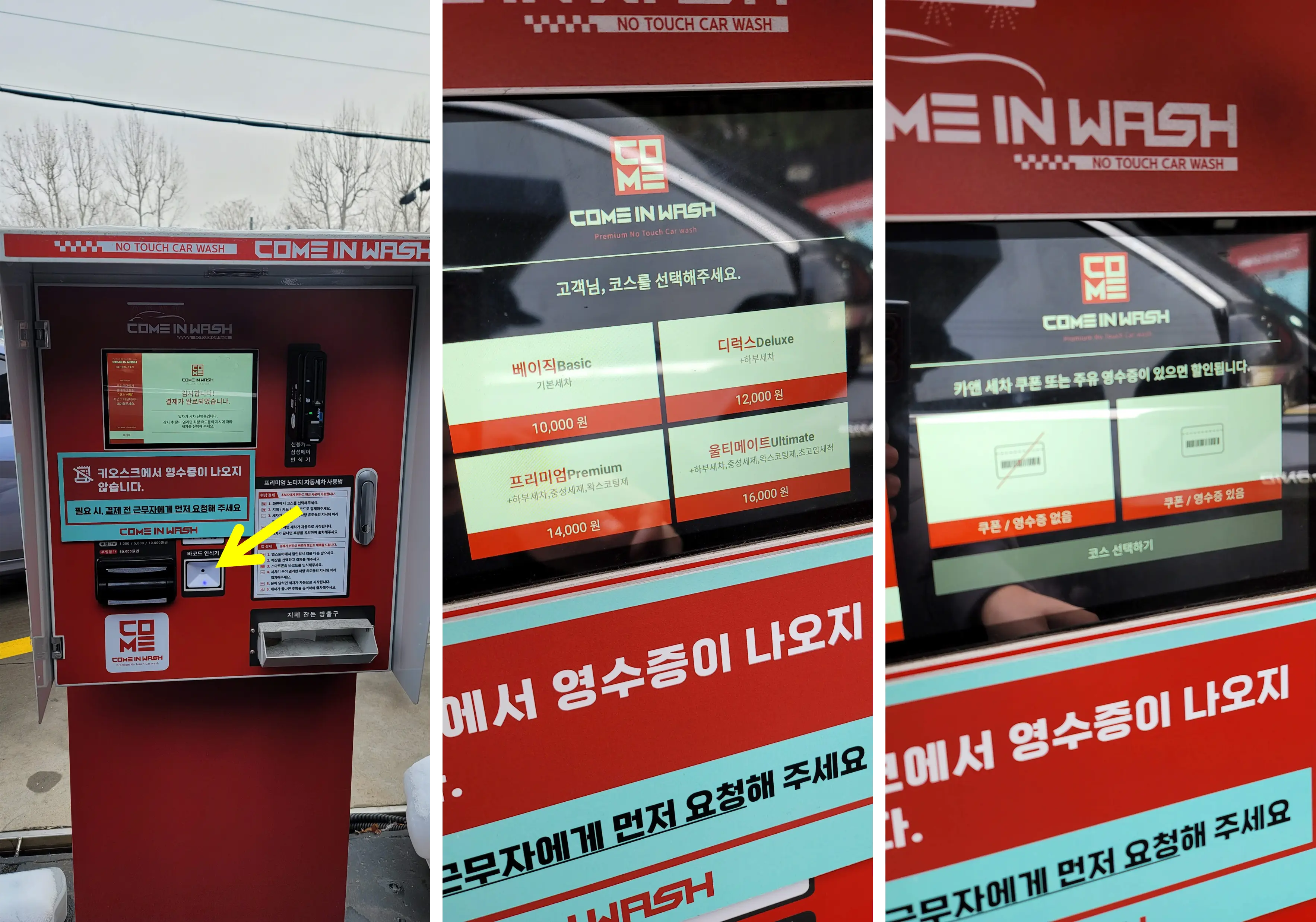 키오스크는 사용하기 쉬웠습니다. 노란색 화살표는 쿠폰이나 '컴인워시 앱' 페이를 사용할 때 쓰는 바코드 리더기입니다. 코스를 선택하고 쿠폰이나 주유 영수증 할인여부를 선택합니다.