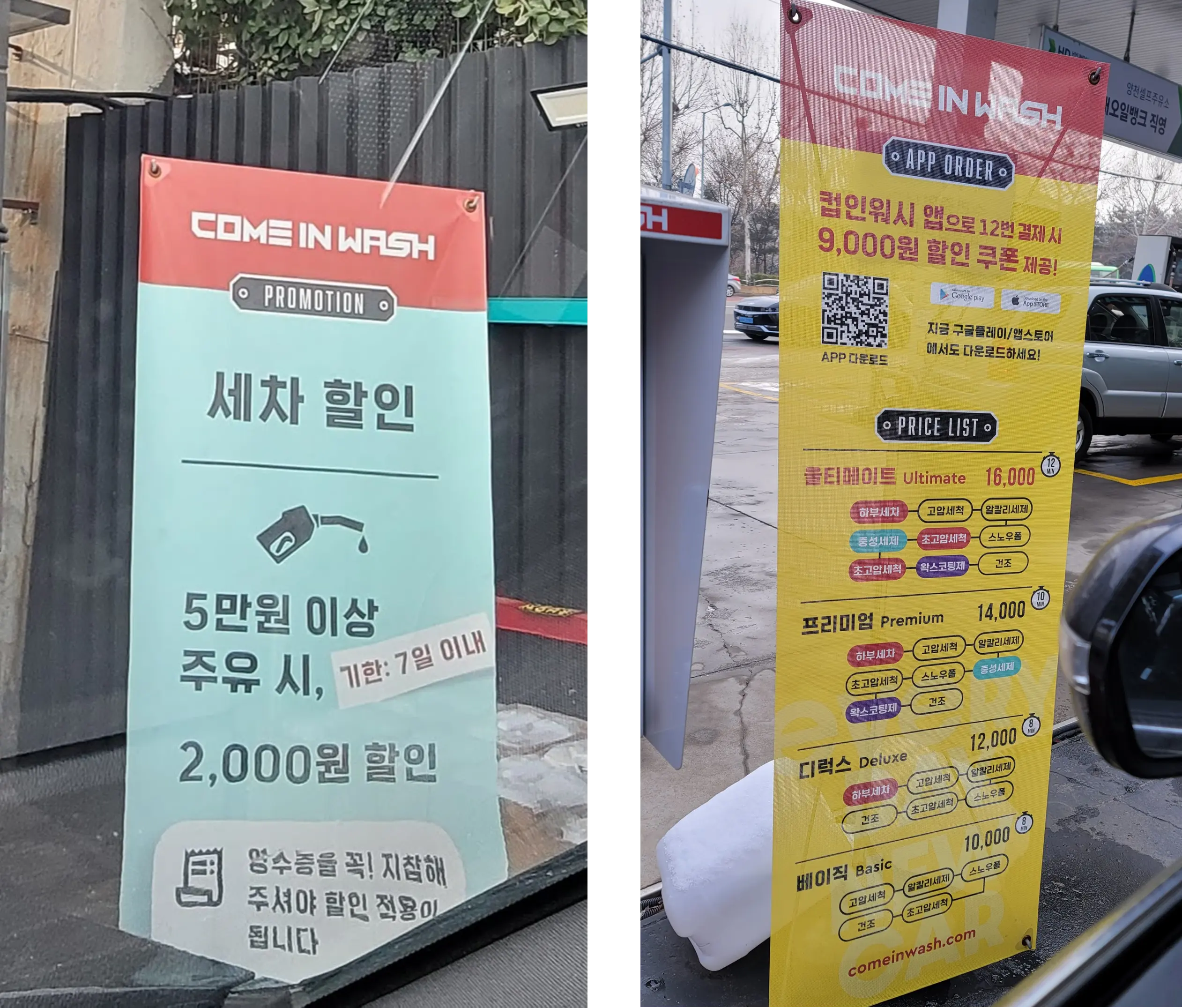 앞쪽으로 가니 할인 내용과 코스별 설명 및 가격 안내판이 있습니다. 저는 이번에 HD현대오일뱅크 세차권을 사용하여 5천 원 할인하고 프리미엄 코스 1만 4천 원짜리로 선택하였습니다.