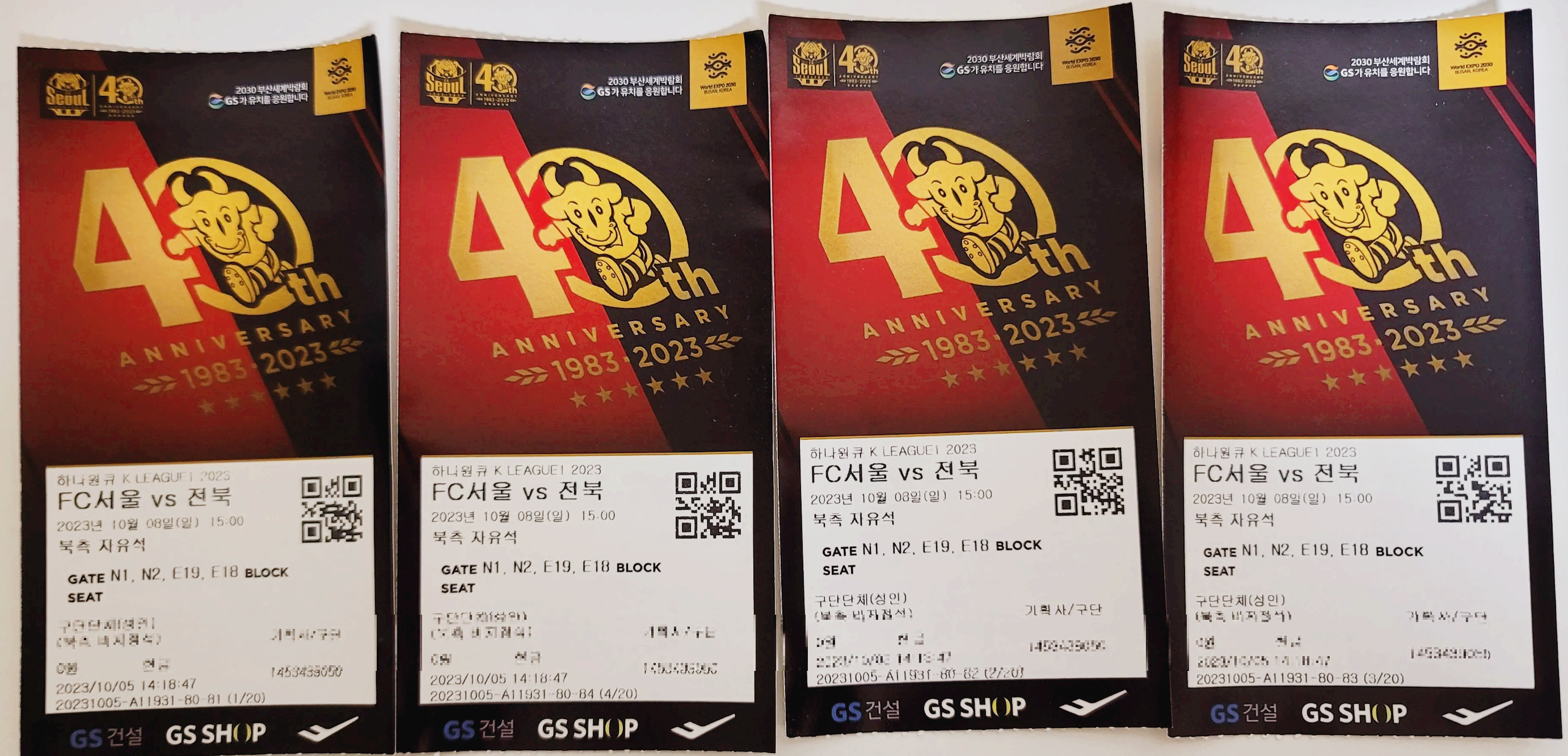 직관 티켓 인증입니다. 40주년 기념 로고가 프린트 되어 있습니다. 이날 경기는 서울 0 : 2 전북으로 경기가 졌기 때문에 흥이 나질 않아 경기 중 사진을 제대로 찍지 못했습니다. 훌리건은 아니지만 저는 열정적인 FC서울 팬입니다!